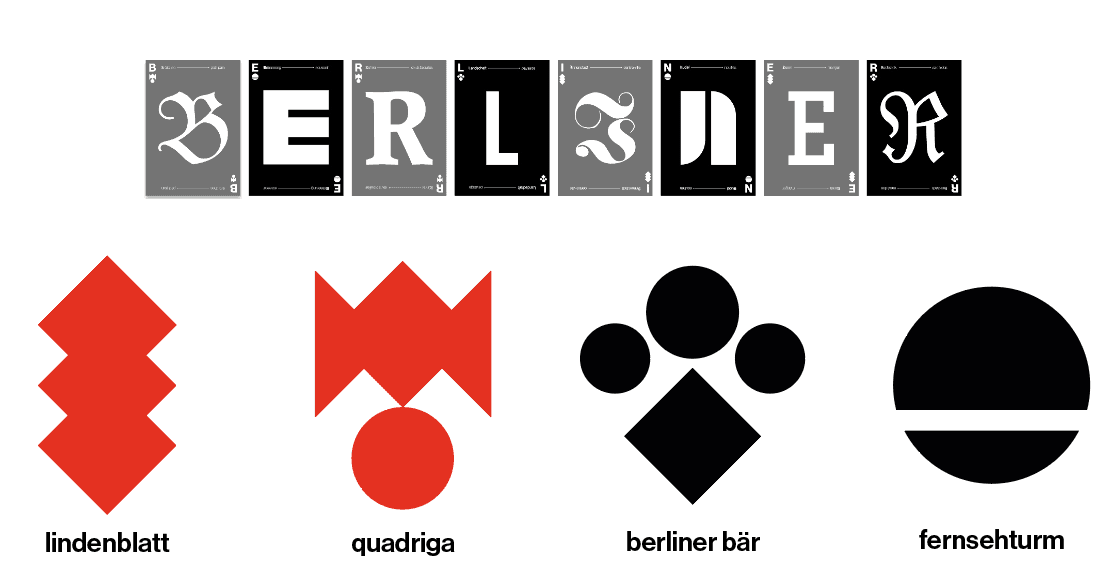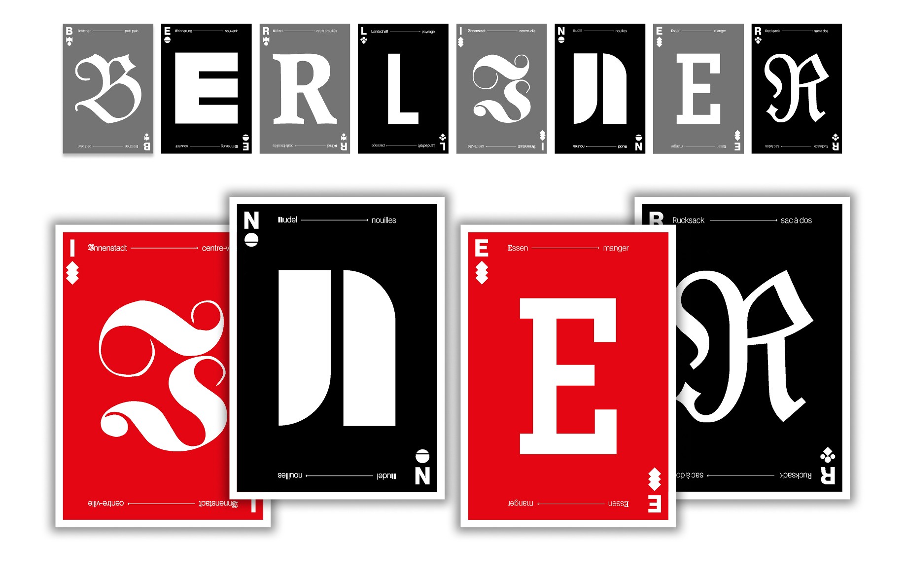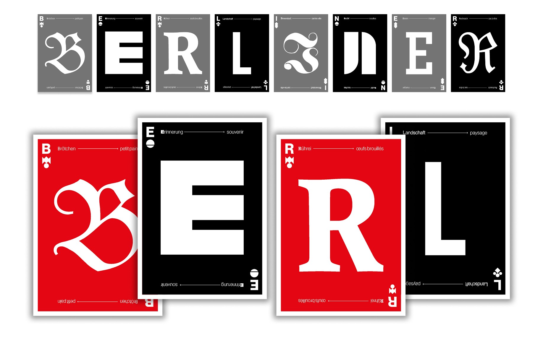 Co-Réalisé avec Jules Haillard-Klein, ce projet transforme la carte postale en série à collectionner inspirée des cartes à jouer. Le rouge et le noir, ainsi que des symboles revisités de Berlin comme la sphère, la feuille, la patte d’ours ou la figure du portail de Brandebourg, composent un système graphique où chaque carte forme un fragment du mot « BERLINER », entre souvenir urbain et design typographique.